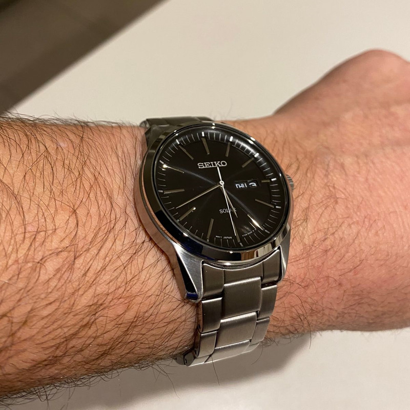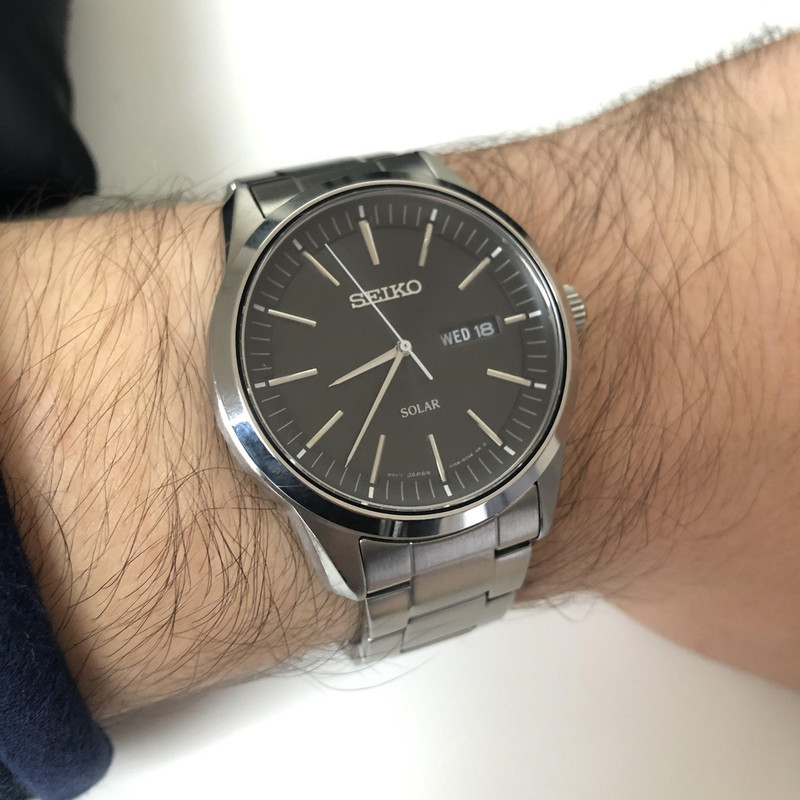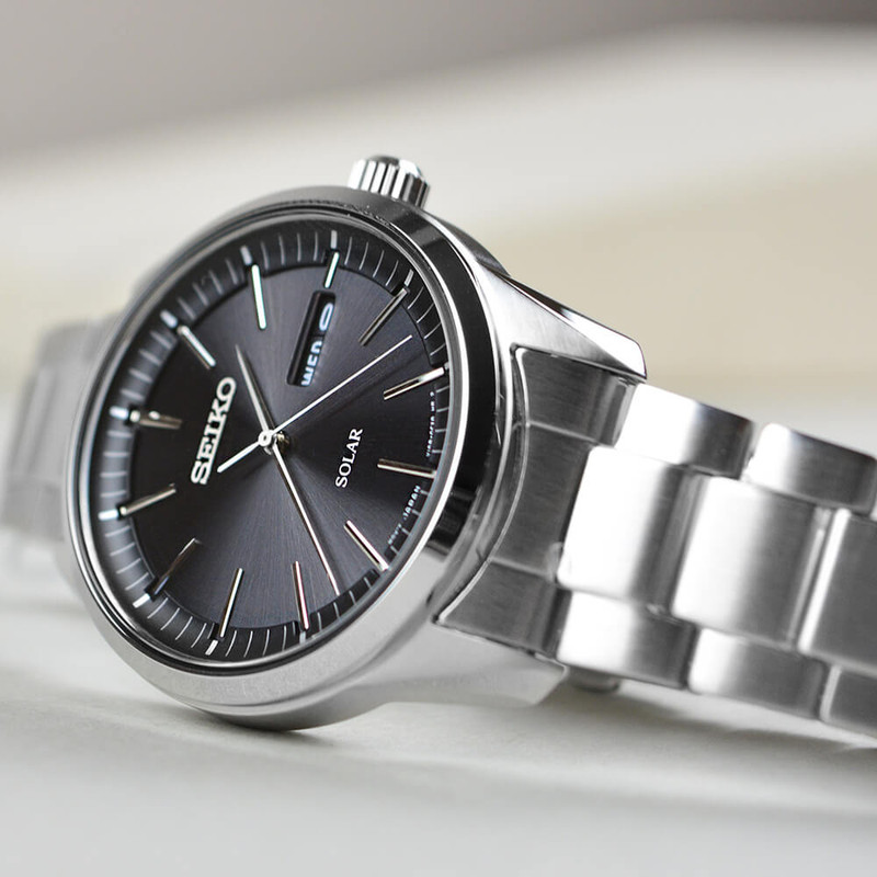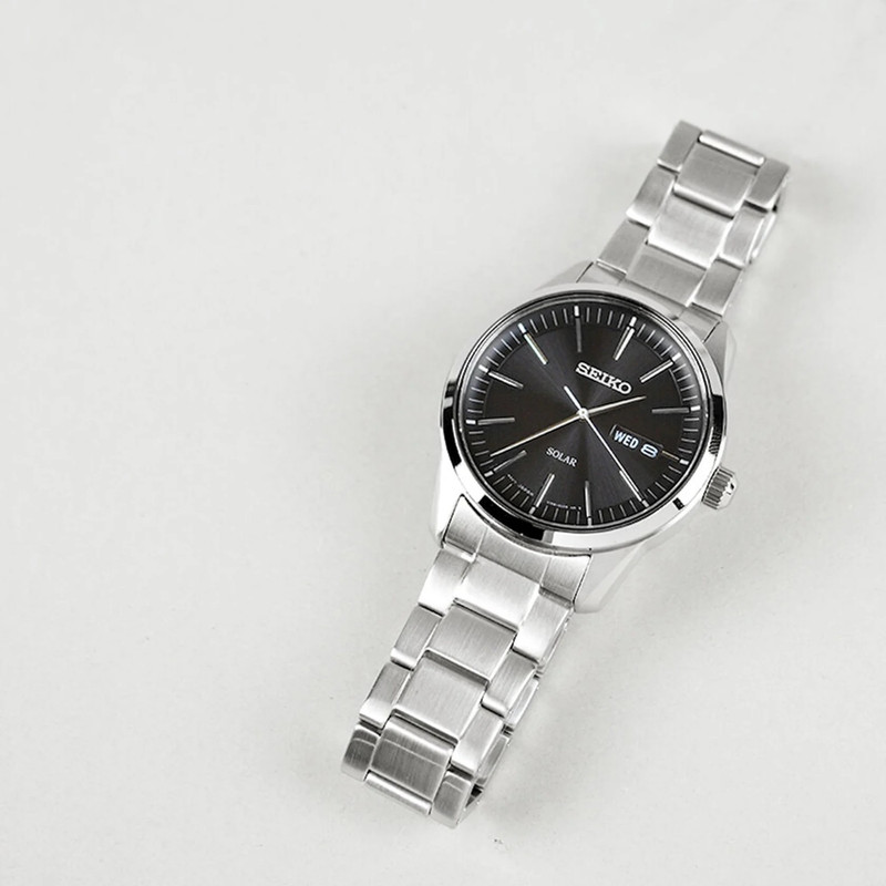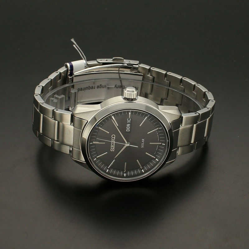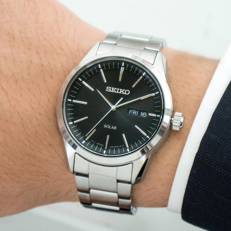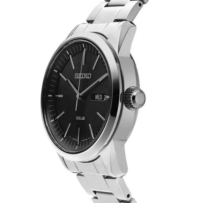 این طرح از برند ساعت سیکو با طراحی و رنگ خاص خود برای تیپهای مجلسی بسیار مناسب میباشد. بند و بدنه ی این ساعت سیکو از جنس استیل است که از ترکیب رنگهای نقره ای و مشکی در آن استفاده شده است. از ویژگیهای منحصر به فرد این ساعت میتوان به طراحی بسیار شیک و مجلسی ساعت در عین سادگی آن اشاره کرد. سیستم کارکرد در این طرح از برند سیکو سولار میباشد که از تکنولوژیهای به روز و جدید سیکو است. در این تکنولوژی نوری که به صفحه ی ساعت میتابد به صورت انرژی الکتریکی در باطری ساعت ذخیره میشود و نیازی به تعویض باطری ندارد. همچنین این ساعت از برند سیکو دارای نمایشگر روزهای هفته و ماه نیز است.