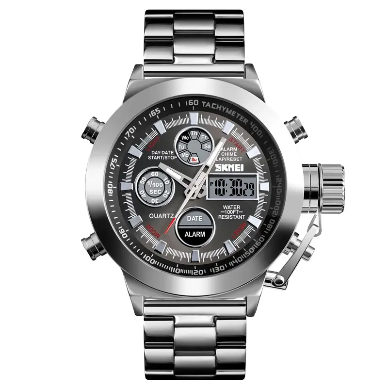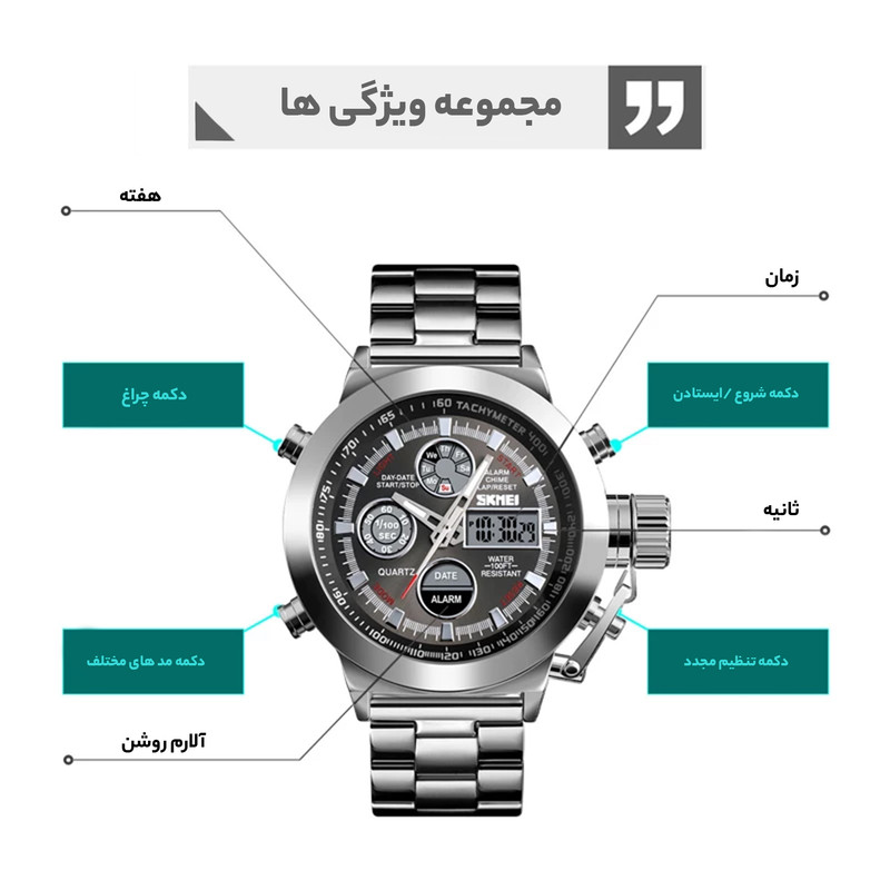 ساعت مچی عقربه‌ای مردانه اسکمی مدل 1515S-NP، یک انتخاب جذاب و مدرن برای آقایانی است که به دنبال ترکیبی از کارایی و طراحی شیک هستند. این ساعت با صفحه‌ای به رنگ نوک مدادی و شکل گرد، ظاهری منحصر به فرد و مدرن به خود گرفته است که به راحتی می‌تواند به عنوان یک اکسسوری شیک در هر نوع فعالیتی، از کژوال گرفته تا مناسب‌های رسمی، استفاده شود. شیشه معدنی به کار رفته در این ساعت با مقاومت خوب در برابر خراش و ضربه، محافظت مطمئنی از صفحه ساعت فراهم می‌کند. بدنه نقره‌ای رنگ و ساخته شده از فلز، علاوه بر زیبایی، استحکام و دوام بالایی را نیز به ارمغان می‌آورد. بند این ساعت نیز از جنس استیل با رنگ نقره‌ای است که از نظر راحتی و کیفیت در سطح بالایی قرار دارد و قفل کلیپسی ساده به راحتی قابل استفاده و تنظیم می‌باشد. با قطر صفحه 57 میلی‌متر و ضخامت بدنه 17 میلی‌متر، این ساعت به وضوح اطلاعات زمان را ارائه می‌دهد و قابلیت نمایش 24 ساعته آن، امکانات بیشتری را برای کاربرانش فراهم می‌آورد. عرض قاب 56 میلی‌متری، به تدریج به زیبایی و تأثیر بصری این ساعت افزوده است. موتور کوارتز به کار رفته در این ساعت، دقت و عملکرد قابل اعتمادی را تضمین می‌کند و اطمینان خاطر از زمان دقیق را برای شما به ارمغان می‌آورد. به طور کلی، ساعت مچی اسکمی مدل 1515S-NP با طراحی زیبا و ویژگی‌های کاربردی، یک گزینه عالی برای آقایان است که به دنبال ساعتی با استایل کلاسیک و کیفیت بالا هستند.