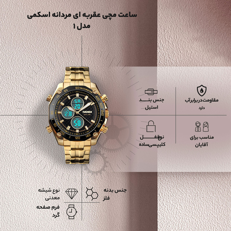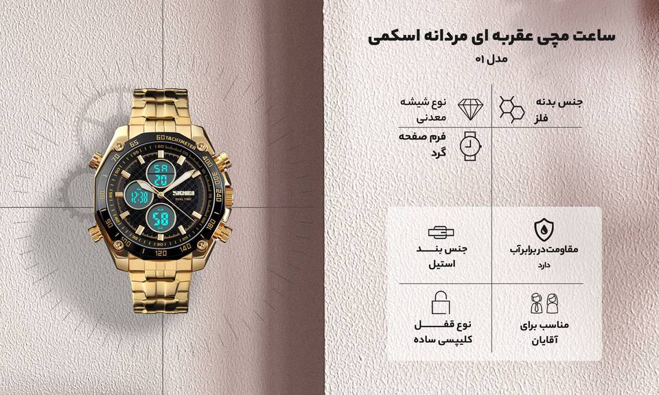 اگر قصد خرید ساعت مچی دارید، ساعت مچی عقربه ای مردانه اسکمی مدل IG یکی از انتخابهایی که است که میتوانید آن را در نظر بگیرید. ساعت در دسته زیور آلاتی قرار میگیرد که در انتخاب آن باید نهایت دقت را داشته باشید. صفحه این ساعت فرمی گرد دارد و رنگ صفحه آن مشکی است. بدنه و بندهای این ساعت از جنس استیل بوده؛ و به ترتیب رنگ تشکیل دهنده آنها طلایی و مشکی است؛ که جلوه و زیبایی آن را چند برابر نموده. میزان مقاومت آن در برابر آب 30 متر است و چون از استیل ضد زنگ ساخته شده به هیچ عنوان در برابر آب آسیب نمیبیند. این ساعت بهوسیله یک قفل کلیپسی دور مچ بسته میشود و انتخاب خوبی برای بانوان خوش پوش است. ساعت یکی از وسایل شخصی است که امروزه مورد استفاده همگان قرار میگیرد. این وسیله بسیار کارآمد است و به جرئت میتوان گفت همه به آن نیاز دارند.